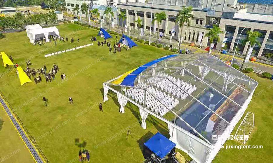 因篷房對搭建場所要求不高,可以搭建在草坪上、水泥地上、水面上等等,活動舉辦者可以更靈活地選擇自己想要搭建的場所。為了更為人性化,透明篷房還有各種形狀和靈活的結構組合,而且搭建簡易迅速、施工周期短,非常適合用于戶外短期或者長期的活動。